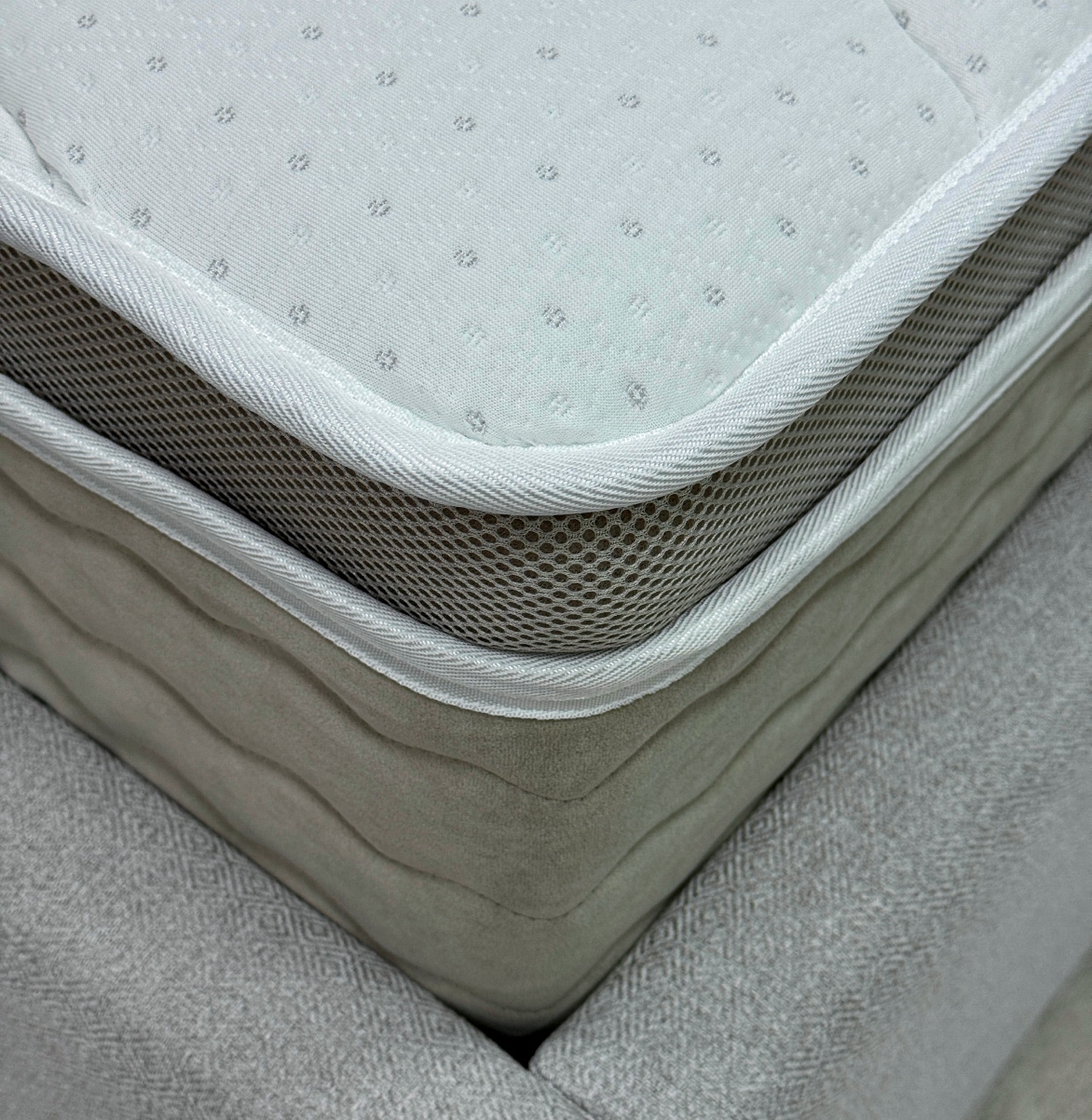Евротоппер в матрасе позволяет увеличить высоту модели и применять разные материалы в бурлете. Объемная 3D сетка, расположена непосредственно под верхним чехлом, что обеспечивает существенно лучшую вентиляцию спального места.
